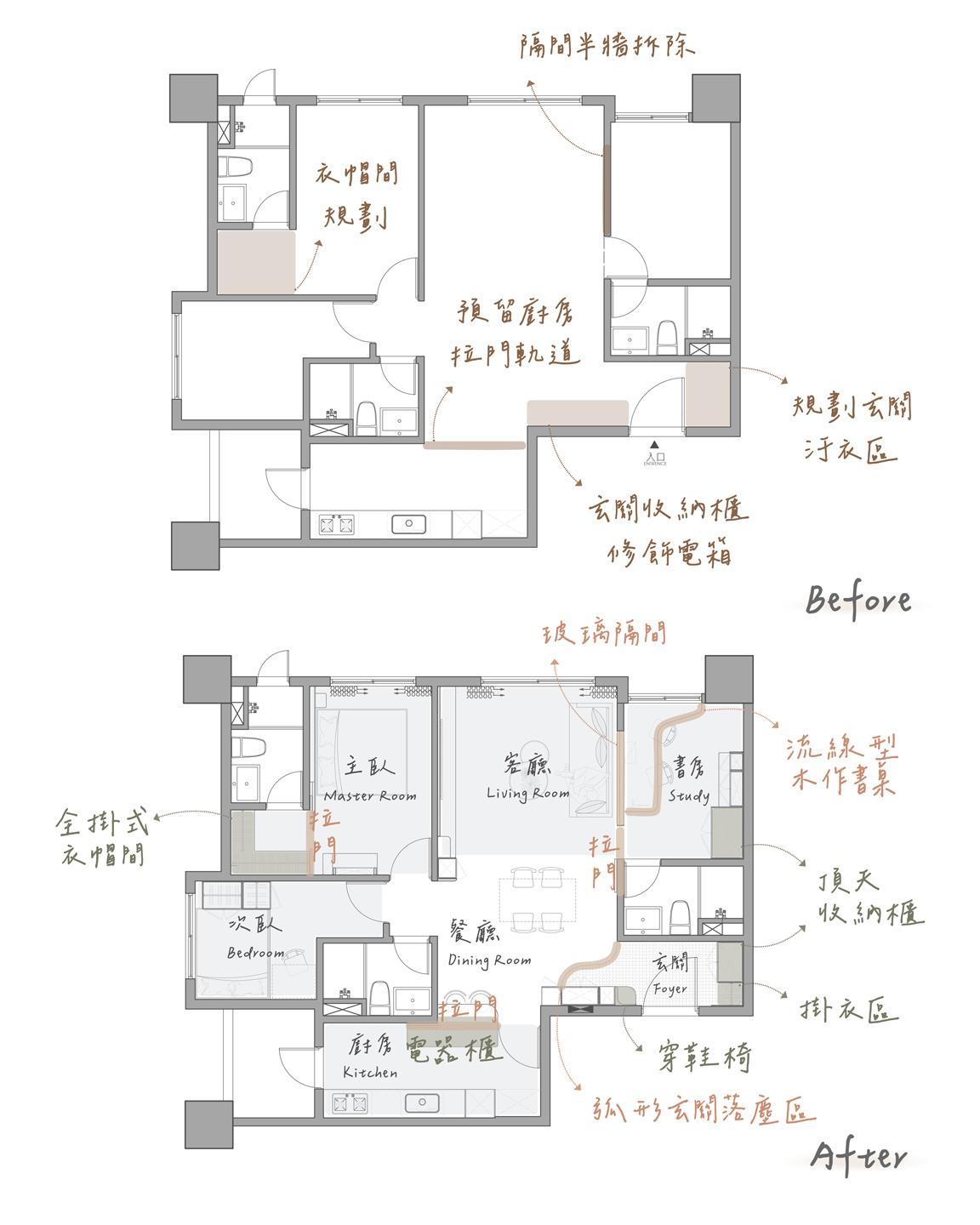 從玄關的弧線過渡,延伸到餐桌上微亮的月光燈,